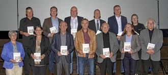 Die Autoren, Bürgermeister und Referent bei der Überreichung des neuen Schmelzer Heimatheftes. 1. Reihe: v.l.n. r.: Hanni Glansdorp, Dr. Sabine Faust, Emil Petry, Alois Johann, Elmar Schmitt, Dr. Edith Glansdorp; Hans-Karl König. 2. Reihe: v.l.n.r.: Volker Ewen, Wolfram Lang, Dr. Eric Glansdorp, Prof. Dr. Markus Groß, Reiner Quinten; Margit Müller.