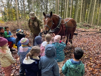 Der Pferderücker Ernst Linnebach erklärte den Kindern, wie Pferde früher in der Holzernte eingesetzt wurden und warum diese Methode auch heute noch in bestimmten Bereichen der Forstwirtschaft von Bedeutung ist. Anstatt Maschinen zu verwenden, die den Waldboden beschädigen können, wird das Holz hier mit Hilfe des Pferdes schonend aus dem Wald gezogen. Dies ist besonders umweltfreundlich und schützt die Natur.