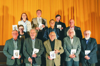 Die Autoren zusammen mit dem Referenten und dem Bürgermeister bei der Buchvorstellung am 27.10.2024. Vlnr. 1. Reihe: Emil Petry; Reiner Schmitt; Elmar Schmitt; Hans Karl König; Referent Manfred Reiter; 2. Reihe: Margit Müller; Alois Johann; Bürgermeister Wolfram Lang; 3. Reihe: Dr. Edith Glansdorp; Dr. Eric Glansdorp; Elias Ewen. Auf dem Foto fehlen die Autoren: Volker Ewen und Armin Emanuel