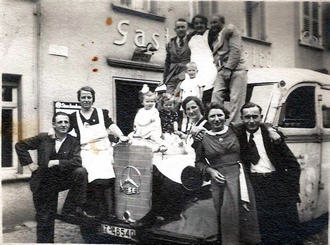 Der Fuhrunternehmer Jakob Petry aus Michelbach steht mit seinem neuen Personentransport-Bus Ende der 1940er Jahre vor dem Gasthaus Petry. Schmelzer Heimatheft 34, 2022, S. 104. Fotoarchiv O. Puhl.