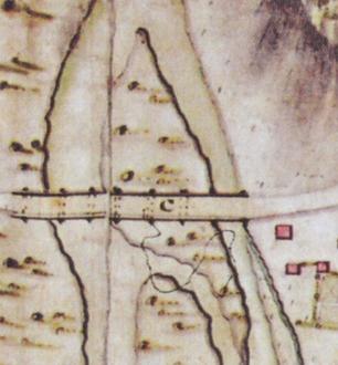Die französische Brücke zwischen Bettingen und Außen um 1710. Neben der Brücke in rot der Zollhausgrundriss.