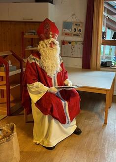 Im Anschluss daran wurden wir natürlich auch vom Nikolaus besucht. Auf seiner Reise von Gruppe zu Gruppe kam er mit den Kindern ins Gespräch und ihm wurden verschiedene Gedichte, Lieder und Tänze vorgeführt. Er überraschte jedes Kind mit einem Weckmann. An dieser Stelle möchten wir uns ganz besonders bei unserem Nikolaus und Bürgermeister Herrn Wolfram Lang bedanken, der sich Zeit für die Kinder unserer Kita genommen hat.