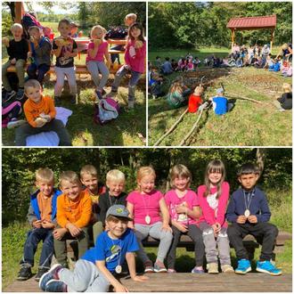 Nach einer kurzen Frühstückspause wanderten wir weiter zum Schützenplatz. Dort sahen wir im „Waldmobil“ präparierte Waldtiere, verschiedene Holzarten und zählten die Jahresringe. Bei der Baumscheibenstaffel arbeitete jede Klasse prima als Team zusammen. Anschließend bekam jedes Kind eine Bratwurst und ein Getränk (gesponsert durch die Waldgenossenschaft Keula). Zum Abschluss suchten alle Kinder gemeinsam Naturmaterialien für ein großes Mandala und wanderten dann zur Schule zurück.