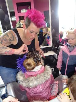 Dann ging es ans Frisieren der Kinderhaare. Zögerlich, aber voller Erwartungen erklärten sich einige Kinder bereit. So konnte sie uns an praktischen Beispielen zeigen, wie die Lockenwickler gehandhabt werden, wie ein Dutt entsteht, wie man bunte Strähnchen zaubern kann und wie eine Frisur mit schicken Schleifen aufgepeppt wird.