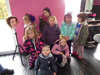 Die Kinder und Erzieherinnen der Bienen- und Schmetterlingsgruppen besuchten den Frisörbetrieb „Nadine‘s Frisörschuppen“ in Holzthaleben.