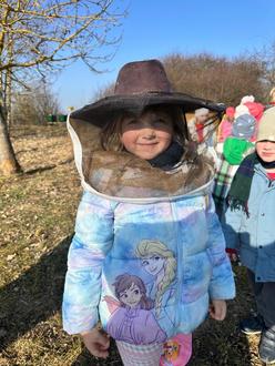 Ein weiteres Highlight war die Begegnung mit Herrn Ronny Klein, der zwei Bienenvölker auf der „Watte“ stehen hat. Er erzählte den Kindern viel Wissenswertes über Bienen und erklärte anschaulich, wie Honig entsteht. Wer wollte, durfte sogar einmal seinen Imker-Hut aufsetzen und sich wie ein echter Imker fühlen.
