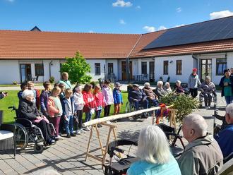 Am 6. Mai 2025 fand in der Tagespflege der Senioren - Wohngemeinschaft „Auf dem Gut“ Holzthaleben ein fröhliches Maibaumaufstellen statt, das in Zusammenarbeit mit den Schülern der 2. Klasse der nahegelegenen Grundschule aus Keula und unserer Senioren - Tagespflege organisiert wurde. Die Veranstaltung brachte Bewohner und Schüler zusammen und sorgte für eine herzliche und festliche Atmosphäre. Alle versammelten sich im Innenhof der Wohngemeinschaft, wo der Maibaum aufgestellt werden sollte. Die Kinder sangen fröhliche Lieder und führten ein kleines Programm auf, welches die Bewohner zum Schmunzeln brachte und viele zum Mitsingen animierte. Das Aufstellen des Maibaums selbst war ein gemeinschaftliches Ereignis. Die Senioren halfen den Kindern, den Baum mit vielen bunten Bändern zu schmücken. Nach dem Aufstellen des Maibaums gab es ein kleines Fest mit Snacks und Getränken. Der Tag endete mit einem gemeinsamen Gruppenfoto vor dem geschmückten Maibaum, dass alle Beteiligten als Erinnerung an diesen besonderen Tag festhalten wollten. Die Veranstaltung war ein voller Erfolg und zeigte, wie wichtig der Austausch zwischen den Generationen ist. Alle waren sich einig, dass das Maibaumaufstellen eine schöne Tradition ist, die im nächsten Jahr unbedingt wiederholt werden sollte.