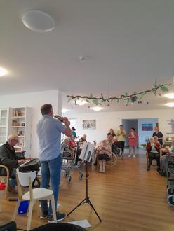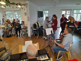 Unsere Bewohner, Tagesgäste und Mitarbeiter hatten sich vor dem Fest mächtig ins Zeug gelegt. Der Innenhof wurde liebevoll geschmückt, Sommerblumen wurden dekoriert, mit der tatkräftigen Unterstützung unserer Bewohner verschiedene Salate für das Fest geschnippelt und auch eine leckere Bowle wurde angesetzt. Leider meinte es der Wettergott an diesem Tag nicht gut mit uns, doch wir haben uns die Stimmung nicht vermiesen lassen und haben das Sommerfest kurzerhand in die Räumlichkeiten der Tagespflege verlegt.