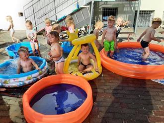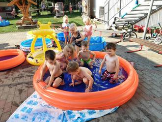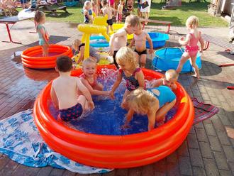 Ein Highlight dieser sonnigen Tage sind die Planschbecken. Die Kinder tauchen mit Begeisterung in das kühle Wasser ein, planschen ausgelassen und spritzen sich gegenseitig nass. Die Planschbecken bieten nicht nur eine erfrischende Abkühlung, sondern auch jede Menge Spaß und fördern spielerisch die motorischen Fähigkeiten der Kinder.