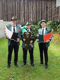 Danach marschierten wir weiter, zum Schützenkönig von 2024, Aron Marshaus, der den Festumzug bereits erwartete. Es wurden Ständchen gespielt, die Ehrenscheibe übergeben, Salut geschossen und zum Umtrunk geladen. Nach geraumer Zeit formierte sich der Festumzug und es ging weiter in Richtung Sägewerk, wo sich dann der Umzug auflöste. Traditionell sammelte sich eine Gruppe unseres Vereins und marschierten mit unserer Vereinsfahne in Richtung Schützenplatz.