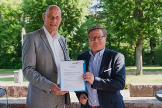 Wirtschaftsminister Wolfgang Tiefensee überbrachte Bürgermeister Thomas Spielmann am 26.6.2023 die Anerkennungsurkunde und verlieh unserer Kurstadt für weitere 10 Jahre den Titel "Zertifiziertes Soleheilbad".
