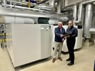 SWH-Geschäftsführer Dirk Nehrkorn (li.) und Markus Klaus, Geschäftsführer der EW Energie GmbH, begutachten die neu installierten Brennwertkessel im Heizkraftwerk „Sperberwiese“ (Foto: Denise Gessinger, Eichsfeldwerke GmbH)
