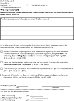 Entsprechend dem Bundesmeldegesetz (vom 03. Mai 2013 (BGBl. I S. 1084), das zuletzt durch Artikel 6 des Gesetzes vom 23. Oktober 2024 (BGBl. I S. 2024 I Nr. 323) geändert worden ist) hat jeder Betroffene das Recht, gegen die Weitergabe seiner Daten in bestimmten Fällen (z.B. an Adressbuchverlage, Parteien- und Wählergruppen) zu widersprechen, wie in den nachstehenden gesetzlichen Grundlagen, sowie im Formular ersichtlich ist.