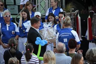 Bürgermeister Thomas Spielmann übergibt ein Geschenk der Liethenschule an den Spielmannszug.