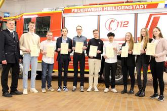Anlässlich der Jahreshauptversammlung konnten acht Feuerwehrangehörige von der Jugendfeuerwehr in die Einsatzabteilung übernommen werden. Außerdem beförderte Bürgermeister Thomas Spielmann insgesamt 22 Feuerwehrangehörige.