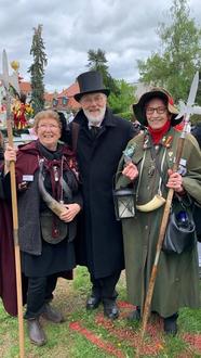 Auch Heiligenstädter Symbolfiguren (im Bild v.l.n.r: Sigrid Seifert, Dietrich Seifert, Heidelinde Liepe) waren Teil dieses farbenfrohen Umzugs und präsentierten stolz unser Heilbad.