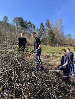 Gemeinsam bewältigt sie verschiedene Aufgaben: Das Holzlager für den Kamin wurde erweitert, Baumstämme fachgerecht zurechtgesägt und die Grünflächen rund um das Gelände gepflegt. Holzreste wie Äste und Gestrüpp wurden im Schredder zerkleinert und verzieren jetzt die Feuerstelle für die anstehenden Lagerfeuer. Auch die neuen Shelter wurden für die bevorstehende Fertigstellung vorbereitet.