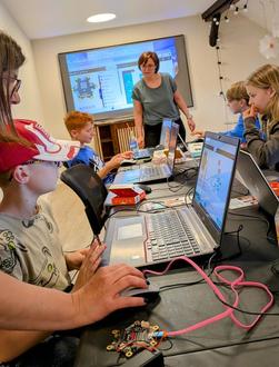 In diesem Workshop lernten Paul, Felix, Anton, Aaron und Felix mit seinem Papa spielerisch, wie sie den Mini-Computer programmieren - von blinkenden LEDs bis hin zu kleinen Sensor-Projekten.