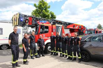 Stadtbrandmeister Stefan Lenk hatte dafür gesorgt, dass sich Heinz Anhalt am letzten Arbeitstag nicht allein auf den Heimweg begeben musste. Standesgemäß begleitete ihn der Löschzug in den Ruhestand. Am Lenkrad der Drehleiter durfte Heinz Anhalt dabei noch einmal selbst Platz nehmen.