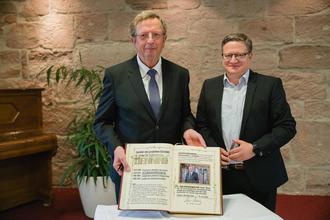 Am Mittwoch, den 19. Juni 2024 wurde diese Ehre Dr. Werner Henning zu Teil. Der scheidende Landrat hat sich in das Goldene Buch unserer Stadt eingetragen. In einer feierlichen Runde im Festsaal des Alten Rathauses bedankte sich Bürgermeister Thomas Spielmann bei ihm für sein unermüdliches Wirken über 35 Jahre hinweg, betonte die vielen persönlichen Beziehungen und sein Engagement für die Kur in der Stadt. Besonders hervorgehoben wurden seine Verdienste um die Neugründung der Kur nach der Wende, die Zusammenführung der Altkreise Worbis und Heiligenstadt zum Landkreis Eichsfeld und die Etablierung des Storm-Museums. Frau Monika Potrykus, Vorsitzende des Stormvereins, würdigte in ihrer Laudatio Hennings selbstlosen Einsatz, seine tiefe Verbundenheit zu den Menschen und seinen Beitrag zur kulturellen und infrastrukturellen Entwicklung der Region.