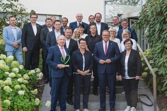 Gruppenfoto beim RegionalDialog der Eichsfeldwerke: Ministerpräsident Mario Voigt überreichte Ulrich Gabel, Geschäftsführer der Eichsfeldwerke, erstmals das „Grüne Herz“.