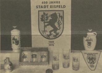 Die Eisfelder Bürger trafen Vorbereitungen für ihre 650-Jahr-Feier, die mit einer Festwoche begangen werden soll. Zu den Feierlichkeiten sind verschiedene Souvenirs erhältlich u.a. Biergläser mit Stadtmotiven, Wimpel, Gedenkmünzen, Likörflaschen und Portemonnaies.