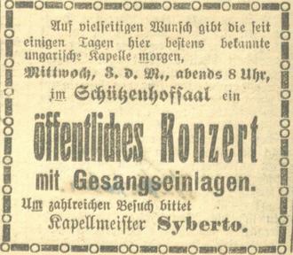 estern abend gab im vollbesetzten Saale des Schützenhofes Herr Kapellmeister Syberto mit seiner bekannten Gruppe ein Konzert. Ungeheurer Beifall löse sein „ungarischer Kanarienmarsch“ und „Großmütterchen“ aus. Bis gegen 11 Uhr standen alle Anwesenden im Banne seiner berauschenden Töne, und zu mancher Dreingabe mußte sich der geniale Künstler bequemen. Hochbefriedigt und voller Bewunderung über die Geheimnisse der reinsten Kunst, ging die Menge nur ungern auseinander.“