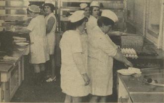 28.06.1974 Themar. In der Betriebsküche des VEB Südthüringer Möbelwerke Themar trafen sich Kochmannschaften aus dem gesamten Kreisgebiet zu einem Kochwettbewerb im Rahmen des Leistungsvergleichs der Schulküchen. Unter den Augen einer Jury haben sechs Mannschaften mit je einem Koch und einem Beikoch am Herd ein Mittagessen zuzubereiten, das anschließend von den Jurymitgliedern, Gästen, Schülern, Elternbeiratsmitgliedern und Werktätigen bewertet wird.