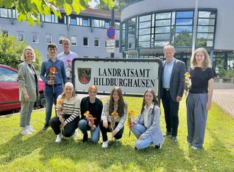 v. l. n. r. Ausbilderin Sina Thon, Jeremy Hopf, Stephan Rothenburg, Anna Werner, Leonie Groß, Angelina Maria Hörnlein, Elina Scheler, Landrat Thomas Müller, Anny Toska Heym
