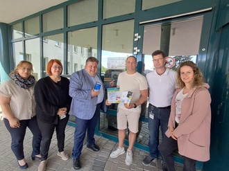 Am 20.05.2025 überreichte Christina Medrow (1. v.r.) vom Kinder- und Jugendschutzdienst „Villa Immergrün“ des Trägerwerk Soziale Dienste in Thüringen gGmbH alle notwendigen Unterlagen und das Notinsel-Zeichen unter anderem an den Landrat Sven Gregor (3. v. l.) und Frank Börner (3. v. r.). Herr Börner ist als Sachbearbeiter im Foyer der erste Ansprechpartner für Kinder, die das Landratsamt als sichere Schutzzone nutzen möchten. Jedes Kind kann im Landratsamt und bei allen anderen beteiligten Notinseln einen sicheren Zufluchtsort finden.