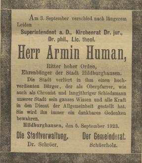 05.09.1923 „Hildburghausen, 04. September. Kirchenrat Dr. Human. Eine Trauerbotschaft durcheilte heute unsere Stadt. Gestern nachmittag verschied nach längerem Leiden unser Ehrenbürger, Herr Superintendent a.D. Kirchenrat Dr. jur. und Dr. phil. Lic. Theol. Armin Human kurz vor Vollendung seines 80. Lebensjahres. Der Tod dieses hochangesehenen Mannes bedeutet für unsere Stadt, in der er von 1883 an als Geistlicher und von 1905 bis 1920 als Ephorus segensreich wirkte, einen schweren Verlust, der sich auf lang Zeit hinaus auf den verschiedensten Gebieten fühlbar machen wird….“
