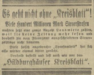 19.09.1923 „Das Sterben der Presse. 113 deutsche Zeitungen und Zeitschriften werden vom 1. Oktober ab nicht mehr erscheinen. Die Zahl dürfte bis Ende d. M. sich noch wesentlich erhöhen, wenn nicht die Zeitungsleser sich entschließen, ihre Abbestellungen rückgängig zu machen. Die Presse muß am Leben erhalten bleiben.“