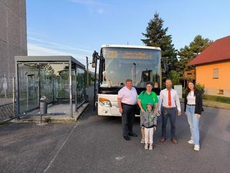 Landrat Sven Gregor, Anke Albrecht-Thiel (Verkehrswacht), Valerio Block (Betriebsleiter WerraBus), Sophie Gräbedünkel (WerraBus/moVeas) und im Vordergrund der „Dummy“.
