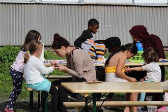An den kreativen Stationen fanden sich viele Kinder unterschiedlichster Nationalitäten ein, um gemeinsam die gestalterischen Angebote zu nutzen. Besonderen Zuspruch erhielten die Glitzer Tattoos sowie die Button Maschine, wo sie ihre eigenen Anstecker „individuell designten“, die sie anschließend mit Stolz ihren Eltern zeigten.