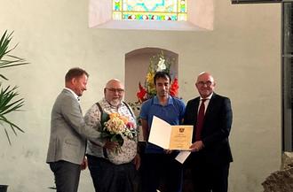 Von rechts stellvertretender Landrat Herr Dirk Lindner, Preisträger Andreas und Matthias Krauß und Herr Daniel Reiche (Untere Denkmalschutzbehörde)