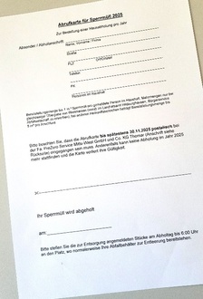 Neu ab diesem Jahr ist, dass diese Abrufkarte bis spätestens 30.11.25 beim Entsorger PreZero in Themar eingegangen sein muss. Nur dann kann eine Abholung für das aktuelle Jahr 2025 gewährleistet werden.