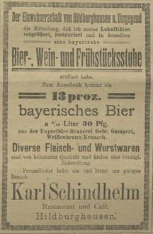 26.10.1924 „Hildburghausen, 25 Oktober. Das Kaffee Schindhelm in der Knappengasse ist jetzt vollständig neu hergerichtet und erweitert worden, es bietet durch seine heimisch eingerichteten Räume angenehmen Aufenthalt für Jedermann. Durch den Ausschank gut gepflegten bayrischen Vollbieres und guter Weine, durch Verabreichung guten Kaffees und diverser Torten und Gebäck eigener Herstellung, dürft dieses Lokal bald eine gern aufgesuchte Gaststätte sein. Ein gut spielendes elektrisches Klavier mit vorhandener reicher Auswahl in den neuesten Klaviermusikstücken, trägt zur Unterhaltung der Gäste bei.“