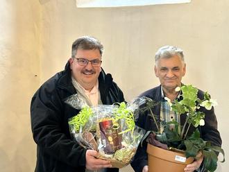 Landrat Sven Gregor überreicht Albert Seifert zum Dank Präsente aus der Region.