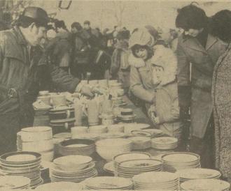31.01.1976 Römhild. Am vergangenen Donnerstag kamen aus vielen Orten im Umkreis von Römhild Schau- und Kauflustige zum traditionellen „Kalten Markt“ Der stets am letzten Donnerstag im Januar stattfindende Markt, bietet ein reichhaltiges Sortiment an Haushaltwaren, Spielwaren und Porzellanerzeugnissen. Gefragte Artikel waren die beliebten Keramik- und Tonprodukte aus dem Grabfeldgebiet. Auch der dazugehörende Taubenmarkt mit seiner reichen Auswahl an Zucht- und Schlachttauben lockte viele Interessenten an.
