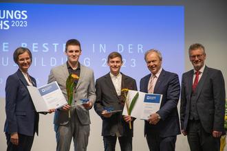 v. l. n. r. IHK-Abteilungsleiterin für Aus- und Weiterbildung Anja Boller, Philipp Kunz, Claudio Heusinger, Landrat Thomas Müller, IHK-Hauptgeschäftführer Dr. Ralf Pieterwas