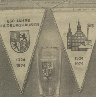 15.02.1974 Hildburghausen. Die ersten Souvenirs zur 650 Jahr-Feier der Stadt Hildburghausen sind dem Rat der Stadt zum Verkauf ausgeliefert worden. Es handelt sich um Seidenwimpel und Bier- und Mehrzweckgläser mit ausgewählten Motiven der Stadt Hildburghausen. Ab April sollen die Souvenirs in verschiedenen Verkaufsstellen angeboten werden.