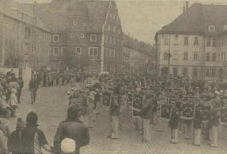 10.03.1976 Hildburghausen. Anläßlich der XX. Kreisdelegiertenkonferenz der FDJ gestalteten am späten Nachmittag 400 Mädchen und Jungen des Bezirksmusikkorps Suhl eine große Musikschau. Zu ihnen gehören aus dem Kreis Hildburghausen das Zentrale Pionier- und FDJ-Blasorchester und der Fanfarenzug Ummerstadt.