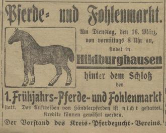 17.03.1926 „Hildburghausen, 16. März. Pferdemarkt. Als der Markt heute vormittag 8 Uhr hinter der Kaserne eröffnet wurde, waren noch wenig Pferde da. Nach und nach hatten sich aber etwa 33 - 35 Pferde eingestellt, die zum Verkauf ausgeboten wurden. Trotzdem sich sehr viele Interessenten eingefunden hatten und rein äußerlich ein lebhafter Betrieb zu beobachten war, wurden wenig Käufe abgeschlossen. Es machte sich auch hier ein sehr starker Geldmangel bemerkbar. Fohlen waren überhaupt nicht zu bemerken. Der Handel konnte bei schönstem Wetter vor sich gehen.“
