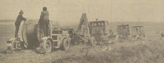 28.04.1973 Kreisgebiet. Zur Verbesserung des Fernsprechverkehrs verlegten die Kollegen des Meisterbereichs Eisfeld, des Fernmeldeamtes Suhl zwischen den Gemeinden Weitersroda, Heßberg und Veilsdorf neue Telefonerdkabel. Mit der modernen Kabelverlegemaschine können Kabel ohne Erdaushub einen Meter tief verlegt werden. Die mit einem Stahlschwert ausgestattete Kabelverlegemaschine und der Kabelwagen werden von 3 Kettenfahrzeugen gezogen.