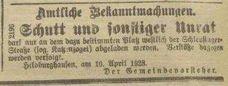 12.04.1923 „Hildburghausen, 11 April. Übe Ordnung. Im näheren und weiteren Umkreise der Stadt sind Straße und Landschaft vielfach durch weggeworfenes Papier, Schutt, besonders aber auch durch alte gebrauchsunfähige Blechgefäße, verunziert worden. Ganz abgesehen von dem darin liegenden Mangel an Rücksicht auf die übrigen Bewohner unserer Gemeinde wird die Stadtverwaltung hierdurch gezwungen, unter Aufwendung hoher Kosten diesen Unrat entfernen zu lassen. Die hierfür aufzuwendenden Beträge könnten gespart oder anderweit zum Wohle der Allgemeinheit verwendet werden, wenn jedermann seinen Hausunrat an den dazu bestimmten Platz westlich der Schleusinger Straße (im Volksmund bekannt als Katzenzogel) bringen würde. Unter Hinweis auf die in der heutigen Zeitung enthaltene amtliche Bekanntmachung bitten wir die Einwohnerschaft, der obigen Anregung Folge zu geben.“