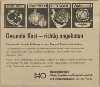 23.04.1974 Hildburghausen. Im Freien Wort findet man auch das „Gemüseangebot der Woche“ vom Kombinat Obst, Gemüse, Speisekartoffeln Suhl, Handelsbetrieb Hildburghausen: Weißkohl, Rotkohl, Spinat, Kohlrüben, Rettiche, rote Beete, Salatgurken, Salat, Schwarzwurzeln, Porree, Zwiebeln, Möhren, Zitronen, Sauerkraut und Faßgurken.