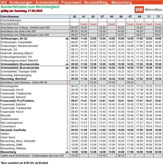 Die Buslinie 202 wurde im vergangenen Jahr zu einer „Rennsteiglinie“ erweitert und verkehrt seither an Wochenenden und Feiertagen durchgehend zwischen Schleusingen, Schmiedefeld, Frauenwald, Neustadt/Rstg. und Masserberg. Die regulären Fahrten bilden zusammen mit der Linie 203 zwischen Masserberg, Schönbrunn und Schleusingen einen touristischen Ringverkehr mit Start und Ziel Schleusingen. Am 17.05.2025 wird das Angebot auf der Linie 202 zwischen Schleusingen, Schmiedefeld und Masserberg auf einen nahezu durchgängigen Stundentakt verdichtet. Alle zwei Stunden besteht in Schleusingen Anschluss von und nach Suhl, Hildburghausen und Eisfeld/Coburg.