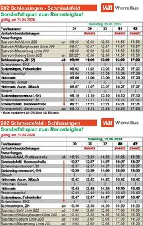 Auch in diesem Jahr bieten der Landkreis Hildburghausen und WerraBus anlässlich des 51. GutsMuths-Rennsteiglaufes am 25.05.2024 wieder zusätzliche Fahrten auf der Buslinie 202 zwischen Schleusingen und Schmiedefeld an.