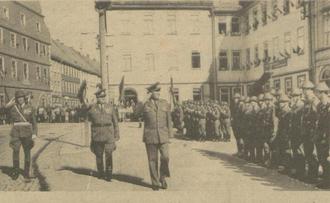 Auf dem Hildburghäuser Marx-Engels-Platz (Markt) fand am 23.05.1975 eine feierliche Vereidigung der Soldaten der Volkspolizei-Bereitschaft „Magnus Poser“ Meiningen statt.