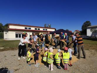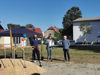 Am 19. September 2025, setzte Bürgermeister Sebastian Schiffer gemeinsam mit dem Ortsteilbürgermeister Steve Spindler und dem Ehrenbürgermeister Hans-Jürgen Langer, den Spatenstich für den Erweiterungsanbau an die Kindertagesstätte im OT Kirchheim.